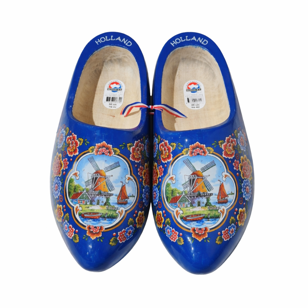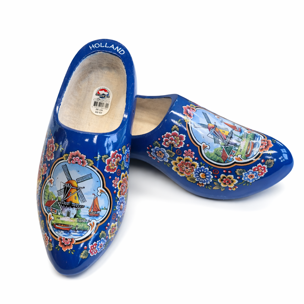 The story behind this design dates back centuries ago: Leather footwear was only affordable for the wealthier people. Wood was a lot more available so it became a cheap solution for the poorer class. Too camouflage their “poor people shoes” they painted it like leather shoes. The three crosses on the shoe represent the lacers. Altough many people mistake them for the three crosses of Amsterdam. This design is the most popular design on wooden shoes in the Netherlands, for many Dutch farmers these clogs are the footwear of choice.