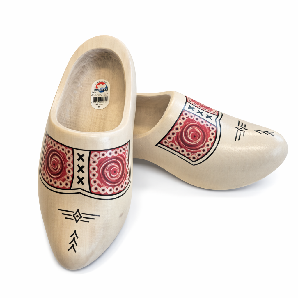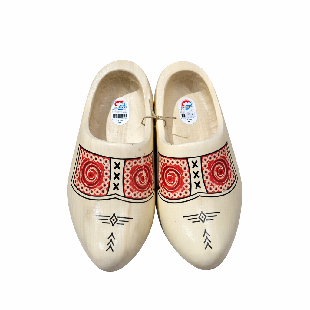 The story behind this design dates back centuries ago: Leather footwear was only affordable for the wealthier people. Wood was a lot more available so it became a cheap solution for the poorer class. Too camouflage their "poor people shoes" they painted it like leather shoes. The three crosses on the shoe represent the lacers. Altough many people mistake them for the three crosses of Amsterdam. This design is the most popular design on wooden shoes in the Netherlands, for many Dutch farmers these clogs are the footwear of choice.
